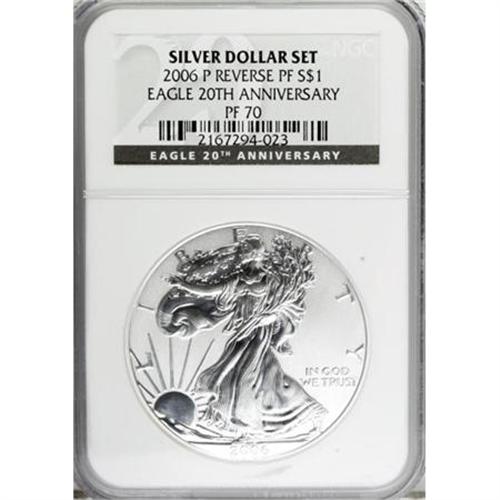 <B>2006-P $1 Eagle 20th Anniversary Reverse Proof PR70 NGC.</B></I> NGC Census: (0/0). PCGS Population (1018/0). (#799977)<BR><BR><b>Shipping:</b> Coins & Currency (<a target="_blank" href="http://www.heritageauctions.com/common/shipping.php">view shipping information</a>)