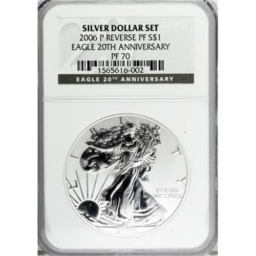 <B>2006-P $1 Eagle 20th Anniversary Reverse Proof PR70 NGC.</B></I> NGC Census: (0/0). PCGS Population (1018/0). (#799977)<BR><BR><b>Shipping:</b> Coins & Currency (<a target="_blank" href="http://www.heritageauctions.com/common/shipping.php">view shipping information</a>)