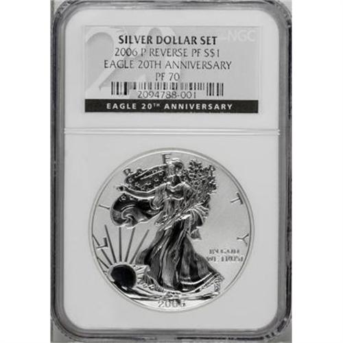 <B>2006-P $1 Reverse Proof Silver Eagle, 20th Anniversary PR70 NGC.</B></I> NGC Census: (0/0). PCGS Population (1368/0). Numismedia Wsl. Price for NGC/PCGS coin in PR70: $700. (#799977)<BR><BR><b>Shipping:</b> Coins & Currency (<a target="_blank" href="http://www.heritageauctions.com/common/shipping.php">view shipping information</a>)