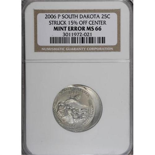<B>2006-P 25C South Dakota Quarter--15% Off Center--MS66 NGC.</B></I> Struck 15% off-center at 9 o'clock. Boldly struck with full luster on both sides. The struck surfaces are exceptional and nearly mark-free.<BR><BR><b>Shipping:</b> Coins & Currency (<a target="_blank" href="http://www.heritageauctions.com/common/shipping.php">view shipping information</a>)