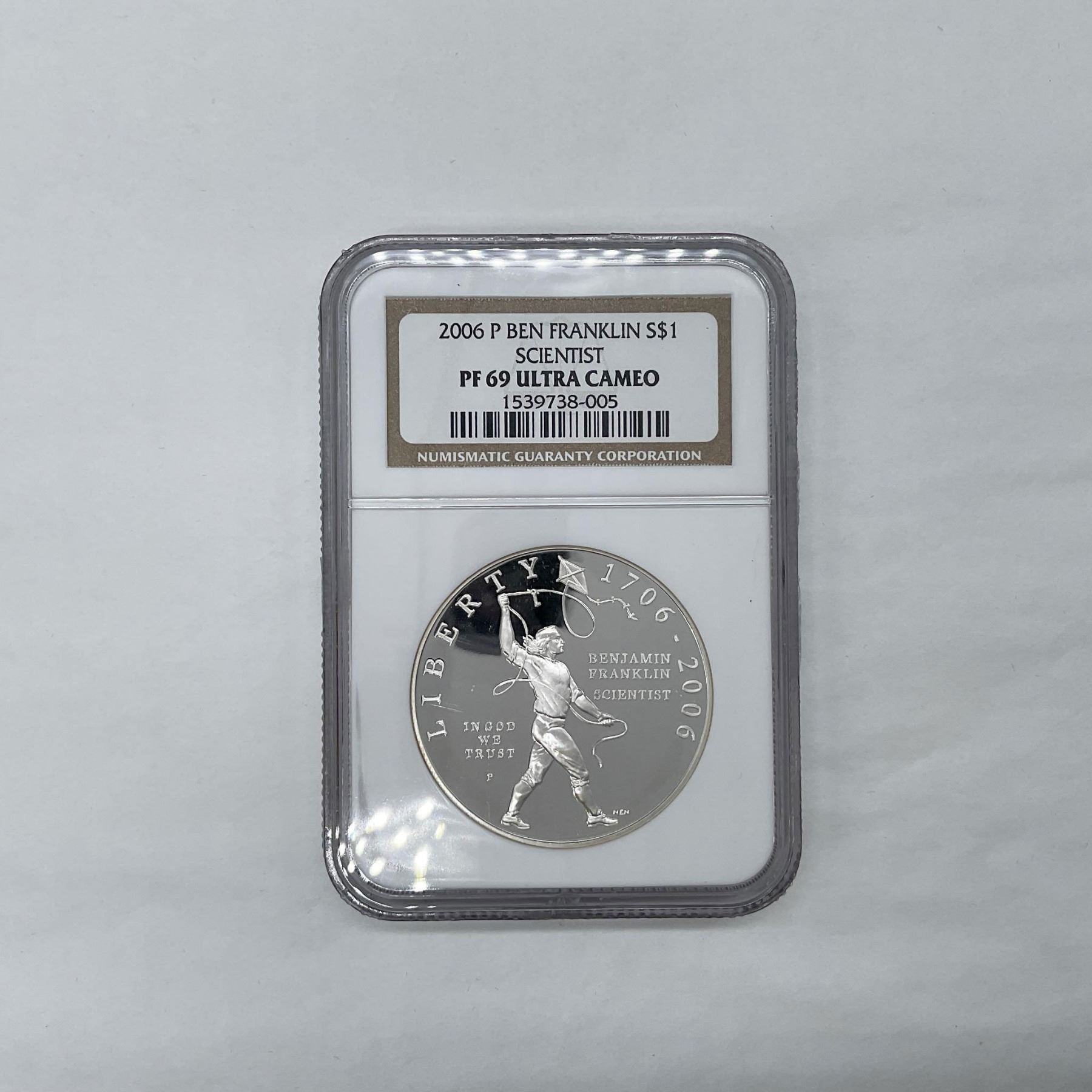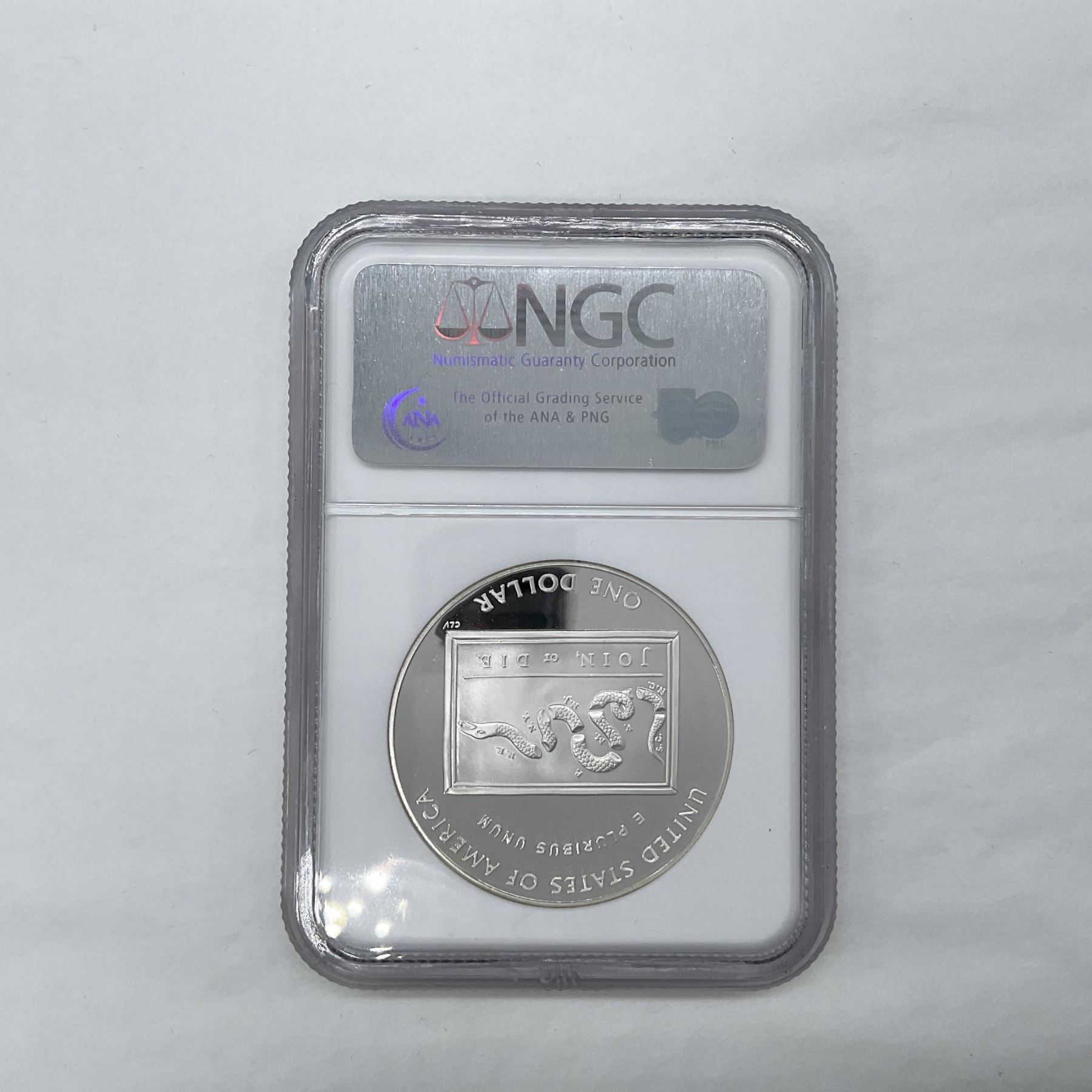 Slabbed PF69 Ultra Cameo. Philadelphia Mint. The obverse side depicts Franklin holding a kite. The reverse side features Join, Or Die political cartoon by Benjamin Franklin. The coin is in a protective case. The case is approximately: 2.25"L x 0.5"W x 3.25"H.