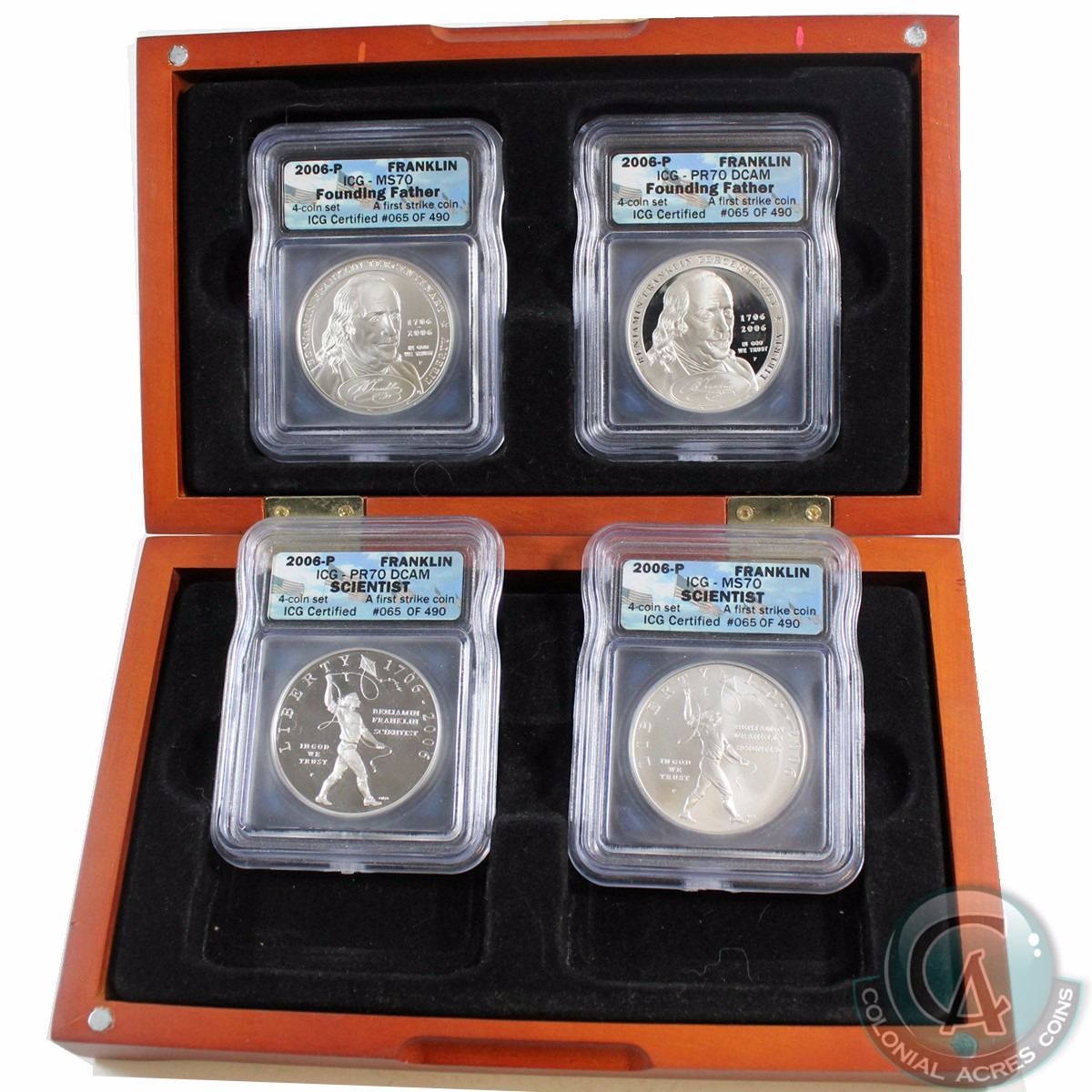 2006-P USA Franklin First Strike ICG Certified MS-70 4-coin Set in Deluxe Display Case. You will receive 'Founding Father' and 'Scientist' Commemorative Silver Dollars with BU and Proof versions. #065 of 490