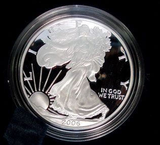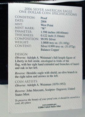 2006 PROOF AMERICAN SILVER EAGLE, WITH NICE ORIGINAL BOX AND CERTIFICATE,