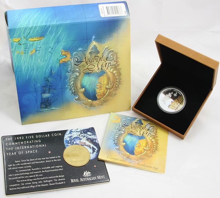 2006 Perth Mint 1oz Silver Coloured Proof Coin, Australia on the map & 1992 R.A.M Uncirculated Five Dollar, year of space. Both in original packaging