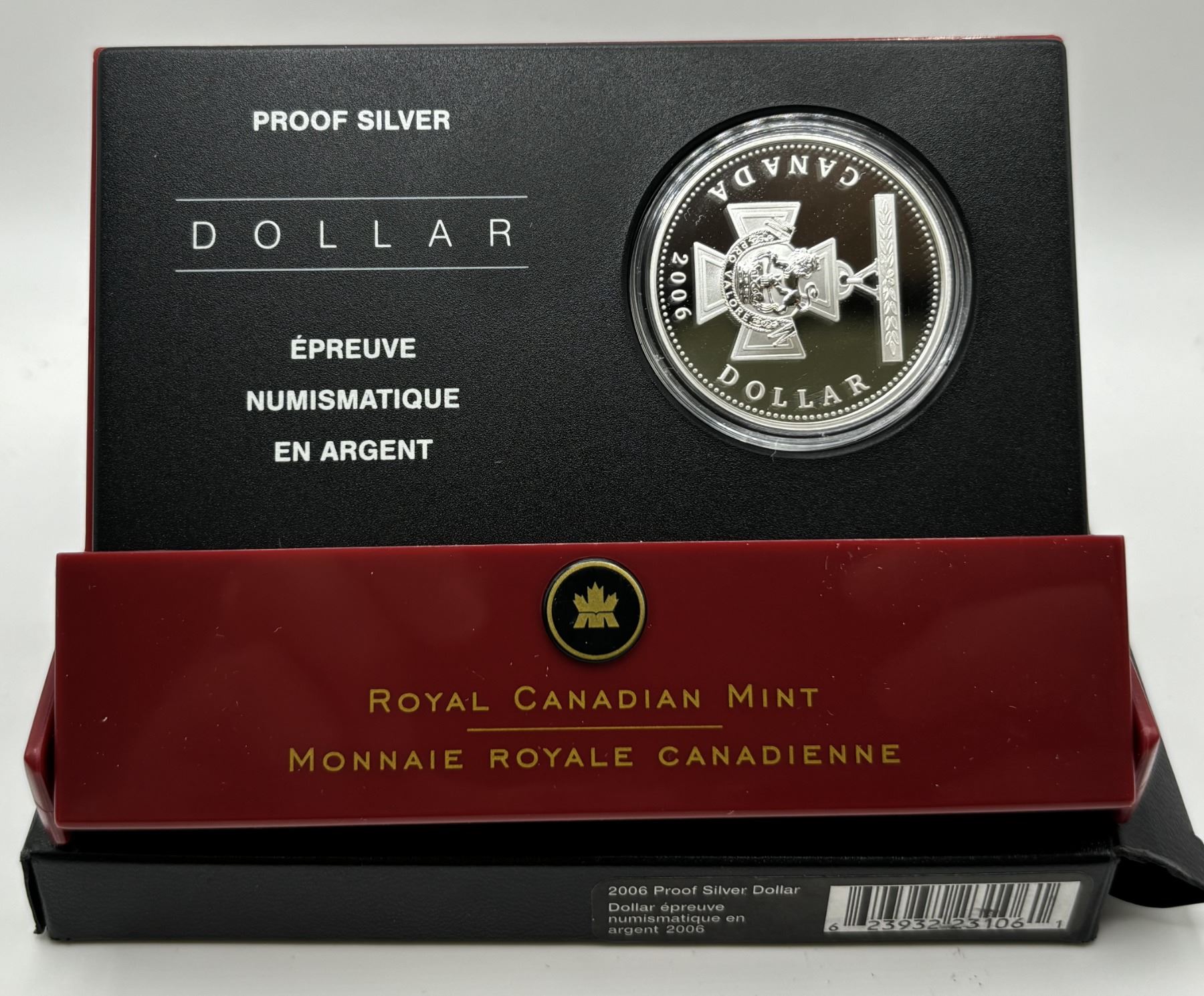 2006 Proof Silver Dollar. 150th Anniversary of the Establishment of the Victoria Cross. Contains 25.175 grams of .9999 fine silver. Comes as issued with COA and outer box