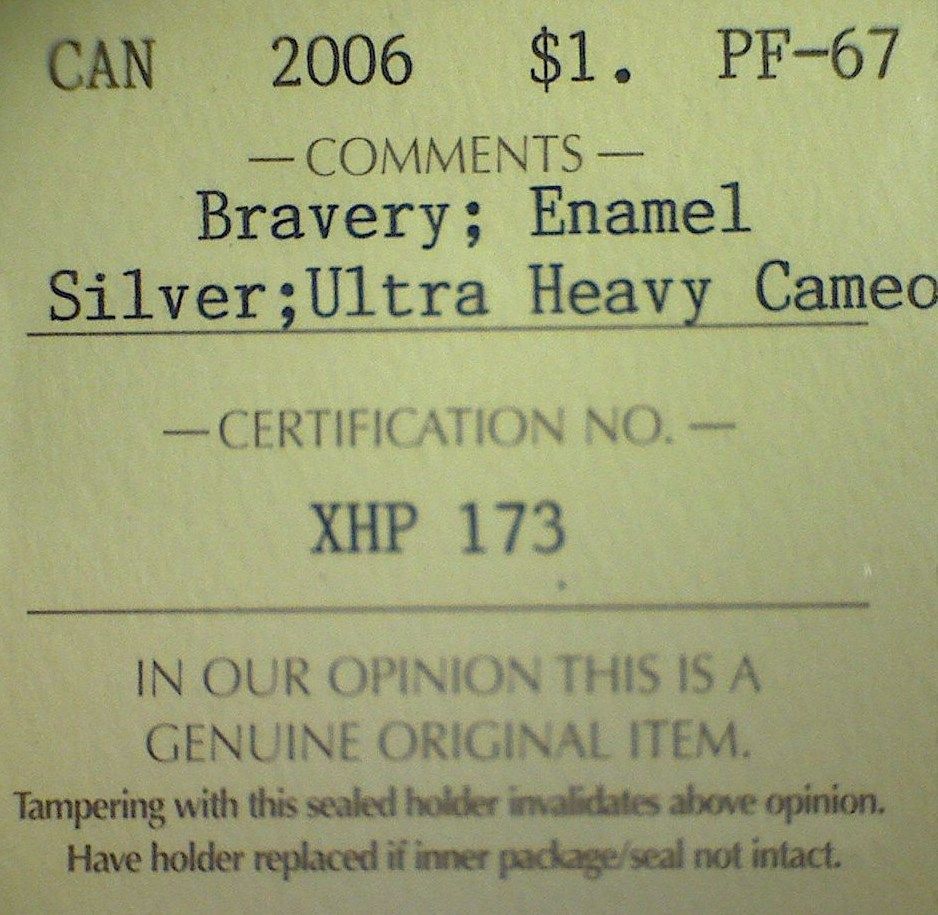 2006 - R.C.M. - $1.00 - Bravery; Enamel - ICCS - PF-67 - Ultra Heavy Cameo