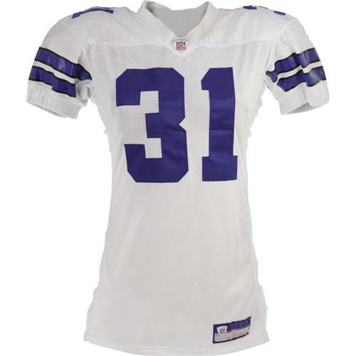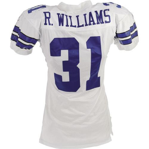 <B>2006 Roy Williams Game Worn Uniform.</B></I> The eighth overall pick in the 2002 draft has proven to be a winner for the Dallas Cowboys, as Pro Bowl appearances each of the last four seasons would indicate. The home white mesh jersey shows fine, hard-hitting wear, with number "31" on chest, back and shoulders in blue tackle twill, and "R. Williams" spelled across rear nameplate. Collar holds "06-48" year/size tagging, and tail features "Reebok" label with size "48" flap tag affixed. Matching "Reebok" label inside pants offers "36" and "S. INS." flap tagging. Number "31" applied in marker to interior waistband, which also holds "05" year label indicating a holdover from previous season. Top to bottom a solid representation from a man already paving a path to Canton.<BR><BR><b>Shipping:</b> Clothing, Costumes & Jerseys (<a target="_blank" href="http://www.heritageauctions.com/common/shipping.php">view shipping information</a>)
