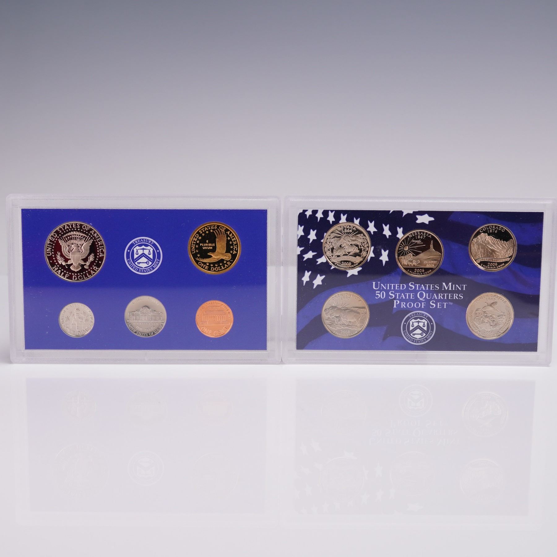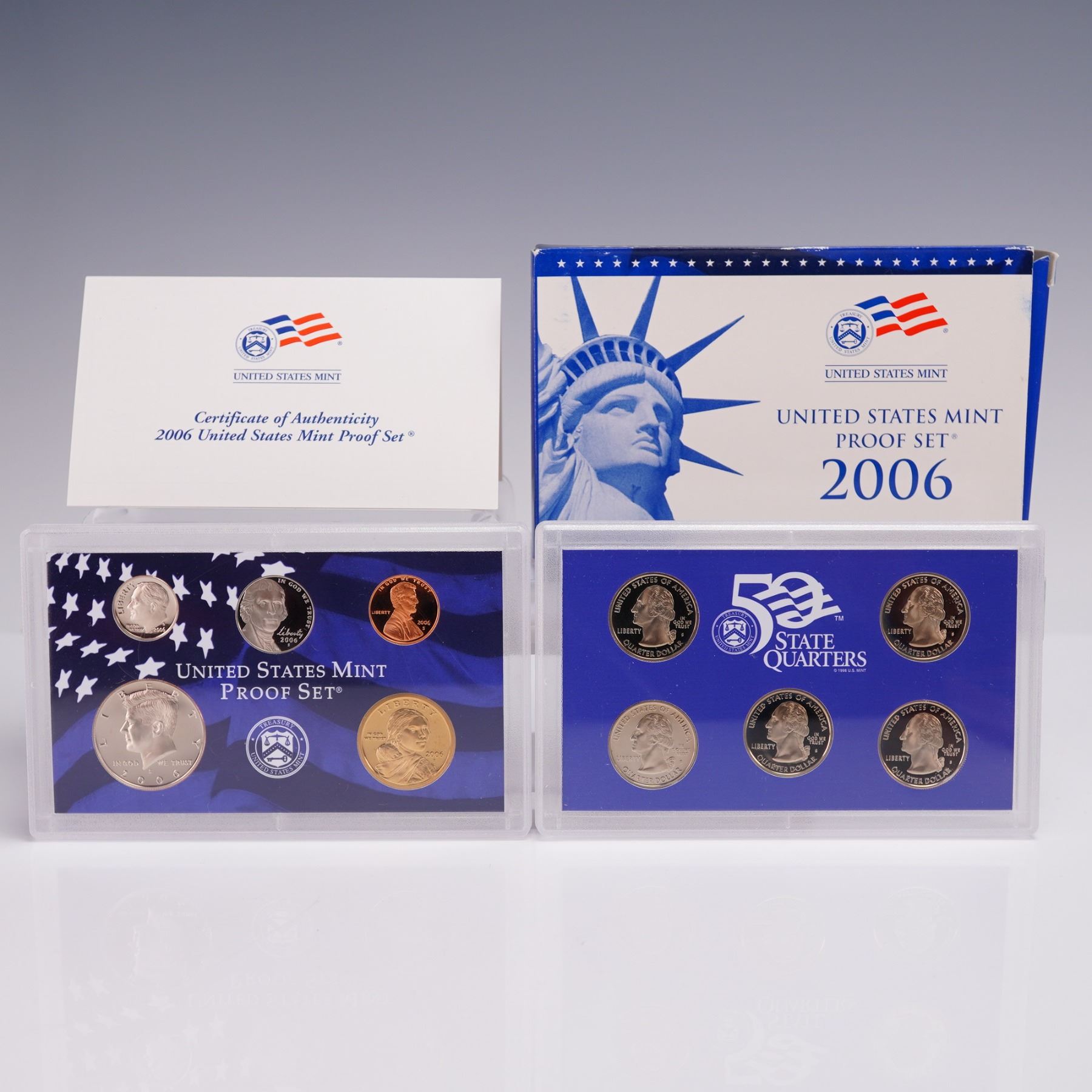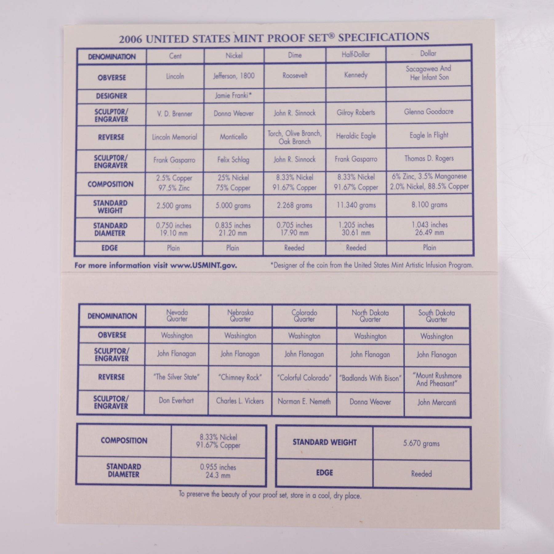 This 2006 United States Mint Proof Set, struck at the San Francisco Mint, includes a total of 10 coins. The set features one example of each standard circulating coin of the year: the Lincoln cent, Jefferson nickel, Roosevelt dime, Kennedy half dollar, and the Sacagawea "Golden" dollar. Also included are five commemorative State Quarters released in 2006 under the 50 State Quarters Program, representing Nevada, Nebraska, Colorado, North Dakota, and South Dakota. All coins are sealed in original United States Mint plastic holders and come with the official packaging and Certificate of Authenticity. United States Mint box: 5.5"L x 3.5"W x 0.75"H.