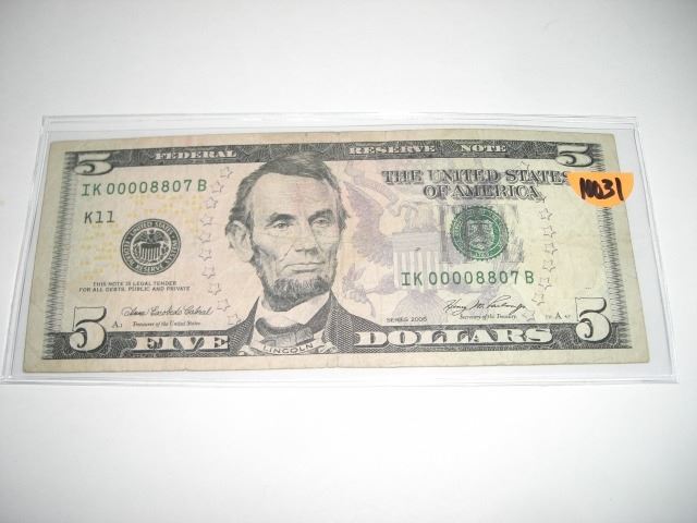 2006 SERIES A EXTREMELY RARE *4 DIGIT SERIAL #* $5.00 SERIAL # IK00008807B. CURRENCY BILL CAME OUT OF SAFE!! ***Coin, Currency & All Items Listed in this auction - Grades, Conditions and Values are not Safe Deposit Coins LLC Responsibilty. Grades, Condition and Values are determined by Consigner(s)