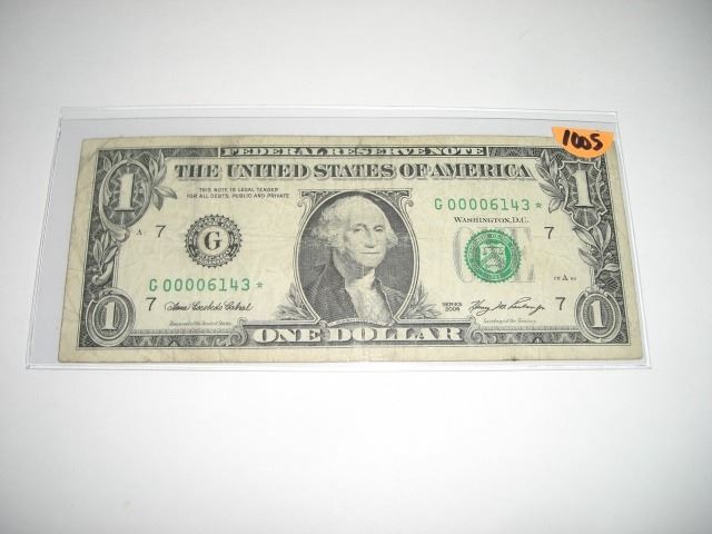 2006 SERIES EXTRA RARE *LOW SERIAL # STAR NOTE-4 DIGITS* $1.00 SERIAL # *G00006143. APPROX VALUE $50.00+!! DOLLAR CAME OUT OF SAFE!! ***Coin, Currency & All Items Listed in this auction - Grades, Conditions and Values are not Safe Deposit Coins LLC Responsibilty. Grades, Condition and Values are determined by Consigner(s) & Buyers ONLY