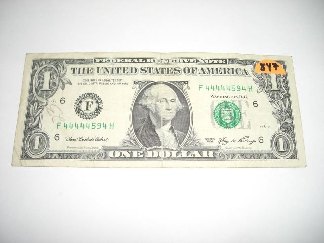 2006 SERIES EXTRA RARE *SAME 6 DIGITS SERIAL DIGITS* $1.00 SERIAL # *F44444594. NICE US DOLLAR*!! DOLLAR CAME OUT OF SAFE!! ***Coin, Currency & All Items Listed in this auction - Grades, Conditions and Values are not Safe Deposit Coins LLC Responsibilty. Grades, Condition and Values are determined by Consigner(s) & Buyers ONLY