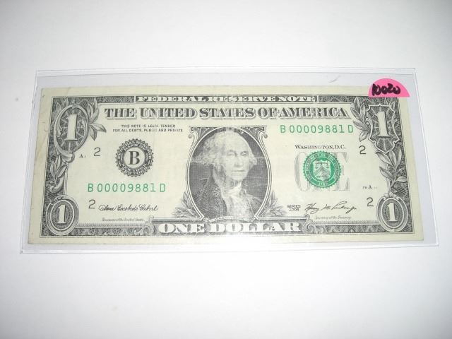 2006 SERIES EXTREMELY RARE *LOW # 4-DIGITS HIGH GRADE* $1.00 SERIAL # B00009881D. DOLLAR CAME OUT OF SAFE!! ***Coin, Currency & All Items Listed in this auction - Grades, Conditions and Values are not Safe Deposit Coins LLC Responsibilty. Grades, Condition and Values are determined by Consigner(s) & Buyers ONLY
