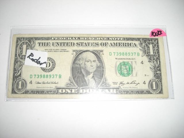 2006 SERIES EXTREMELY RARE *REPEATER SERIAL #* $1.00 SERIAL # D73988937. A REPEATER SERIAL # IS WHEN IT IS THE SAME # FORWARDS OR BACKWARDS. DOLLAR CAME OUT OF SAFE!! ***Coin, Currency & All Items Listed in this auction - Grades, Conditions and Values are not Safe Deposit Coins LLC Responsibilty. Grades, Condition and Values are determined by Consigner(s)