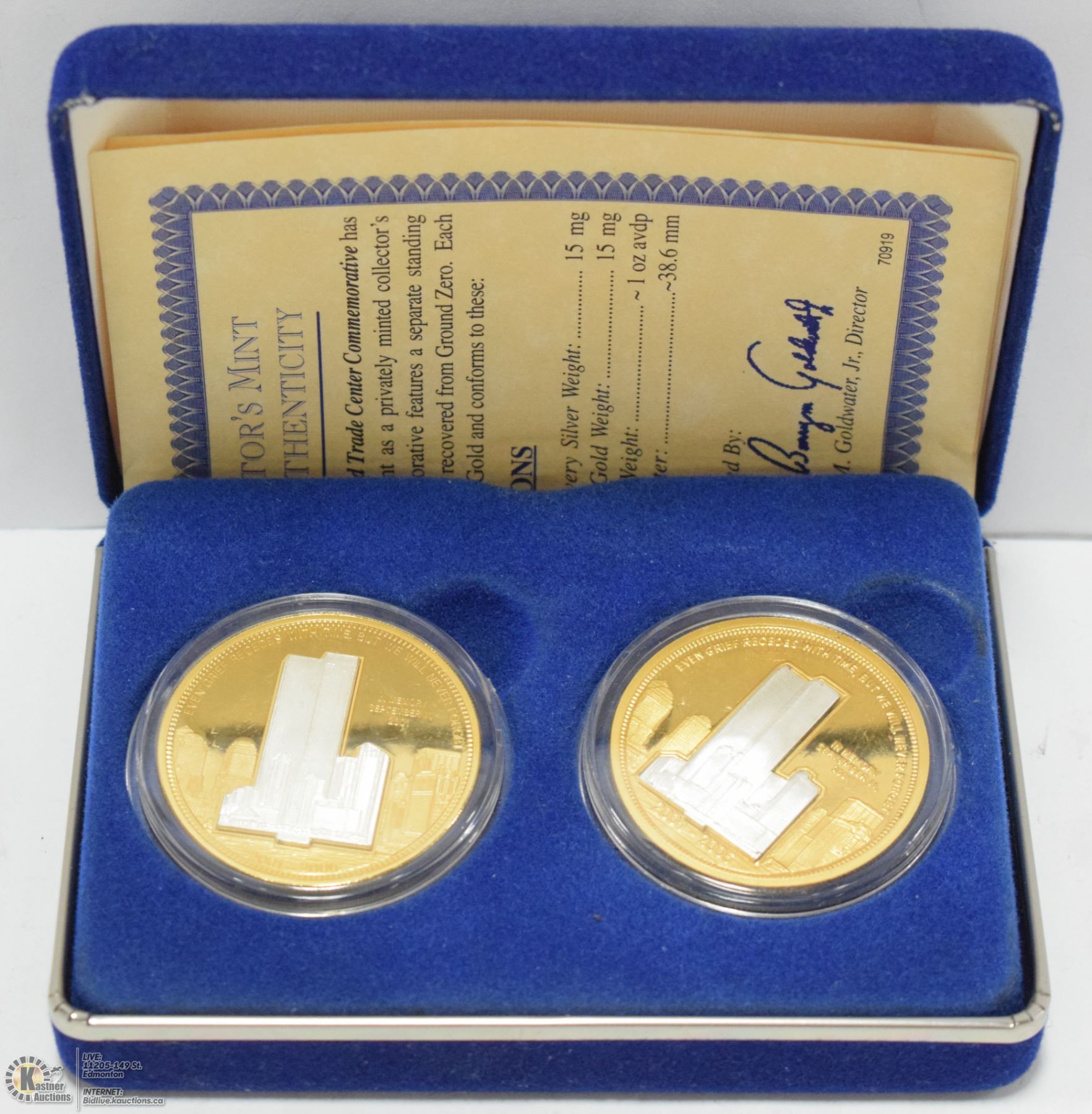 SILVER TOKEN. MADE FROM .999 PURE SILVER RECOVERED FROM GROUND ZERO. ALSO CLAD IN 24 KT PURE GOLD. BY NATIONAL COLLECTOR'S MINT. COMES WITH 2 CERTIFICATES OF AUTHENTICITY AND IN AN ORIGINAL BOX. THE TOWERS STAND UP.