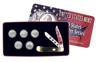 SET INCLUDES ALL FIVES STATE QUARTERS AND A COMBINATION KNIFE WITH 2006 MARKED ON BOLSTER, PICTURES OF EACH STATE QUARTER ON THE BLADE, EST. $35.00 TO $45.00