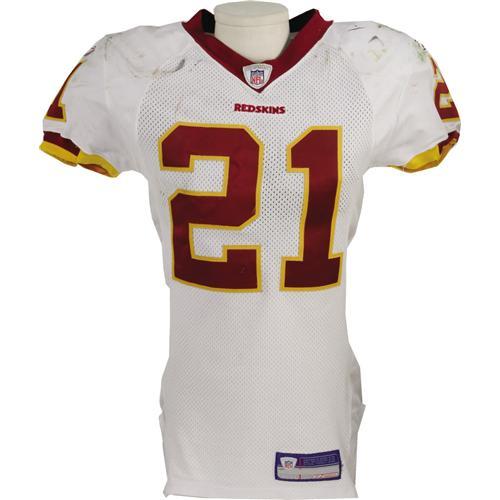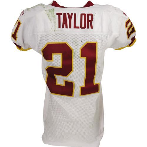 <B>2006 Sean Taylor Game Worn Jersey.</B></I> The fifth overall pick in the 2004 draft put terrific use into this white mesh gamer during a thrilling overtime victory over the Jacksonville Jaguars at FedEx Field. Heavy turf staining throughout, with rough abrasions from contact with opposing helmets. Number "21" is applied with red and yellow tackle twill to chest, back and sleeves. "Taylor" spelled across rear nameplate. Year/size label inside collar reads "06-46," and is joined by "Reebok" label in tail with "46" flap tag. A few team repairs in the shoulder indicates at least one previous game's use. Acquired directly from the Washington Redskins by sports marketing company "Game Exclusives," with their letter of provenance.<BR><BR><b>Shipping:</b> Clothing, Costumes & Jerseys (<a target="_blank" href="http://www.heritageauctions.com/common/shipping.php">view shipping information</a>)