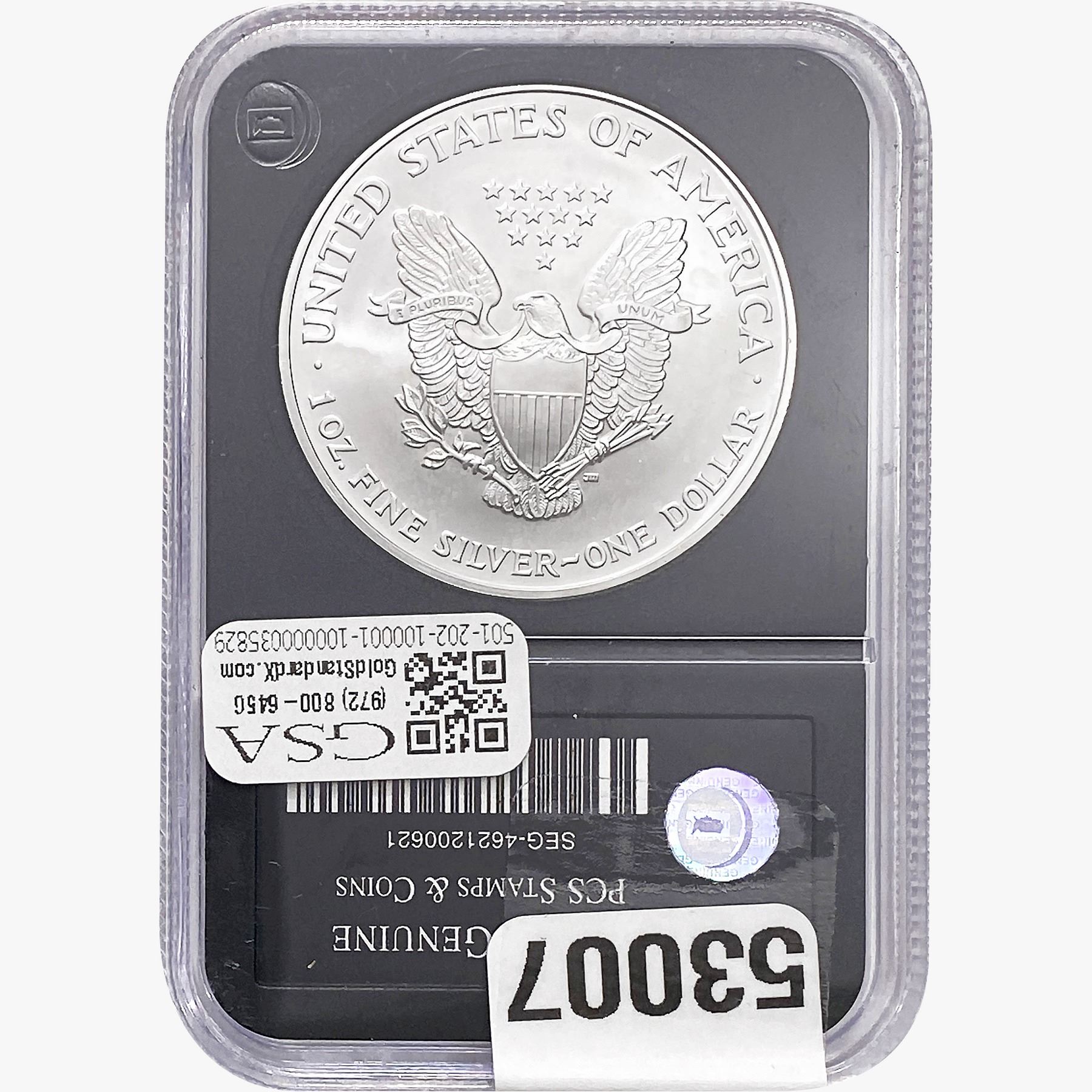 e. Coins sold referencing a third-party grading service are sold “AS IS” without any express or implied warranty, except for a guarantee by GSA that they are genuine. Removal or alteration of the holder, voids all of Bidder’s claims concerning that Product. Certain warranties may be available from the grading services and Bidders are referred to them for further details: Numismatic Guaranty Corporation (NGC), PO Box 4776, Sarasota, FL 34230, www.ngccoin.com/services/writtenguarantee.asp; Professional Coin Grading Services (PCGS), PO Box 9458, Newport Beach, CA 92658, www.pcgs.com/guarantee.html; ANACS, 6555 S. Kenton St., Ste. 303, Englewood, CO 80111; and Independent Coin Grading Co. (ICG), 7901 East Bellview, Ave., Suite 50, Englewood, CO 80111.