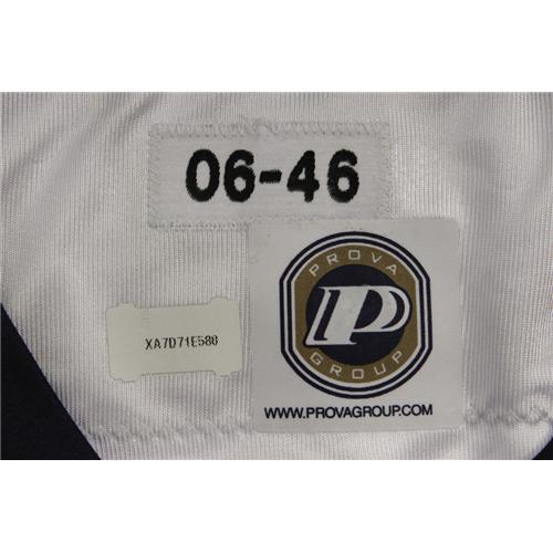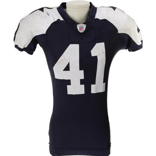 <B>2006 Terence Newman Game Worn Throwback Uniform.</B></I> The 2003 first round draft pick out of Kansas State has proven to be a solid choice for the Cowboys, who notched sixty-three tackles during the 2006 season. Three of those tackles, all solo, came during the Eagles contest in which this uniform saw action, and the green Eagles paint is easy to spot on the jersey's right shoulder. Number "41" appears on chest, back and sleeves in bold tackle twill, with "Newman" spelled across rear nameplate. Collar holds "06-46" labeling, and waistband has custom elasticized waist. Matching pants have markered "41" identifier along with "06" year tag in waistband. "Reebok" label sprouts "32" and "S.I." flap tags. Wonderful, sweaty wear throughout.<BR><BR><b>Shipping:</b> Clothing, Costumes & Jerseys (<a target="_blank" href="http://www.heritageauctions.com/common/shipping.php">view shipping information</a>)