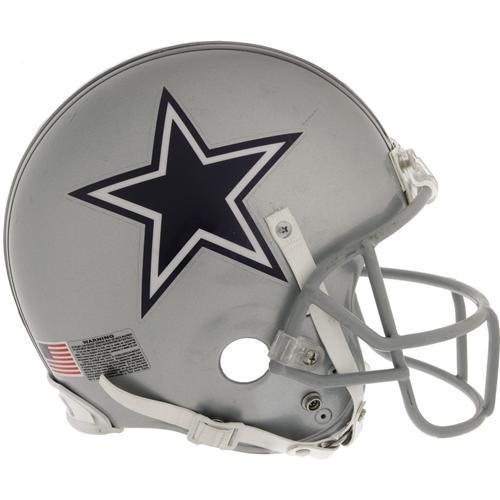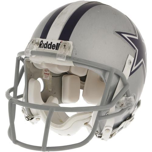 <B>2006 Terry Glenn Game Worn Helmet.</B></I> Though helmets are reconditioned after every game, there are gashes and gouges no equipment manager can remove, and we find a few of them scattered across the exterior shell of this silver battle veteran. Permanently affixed chin strap, with its high hook-up positioning, is still present and shows good, sweaty wear to match the interior padding system. Number "83" is markered onto the chin strap as well. Dymo tape "Glenn" applied to rear center stripe above custom "Cowboys" bumper. Decals of the NFL logo, the American flag, and warning label are affixed in their proper positions. A picture-perfect NFL gamer.<BR><BR><b>Shipping:</b> Clothing, Costumes & Jerseys (<a target="_blank" href="http://www.heritageauctions.com/common/shipping.php">view shipping information</a>)