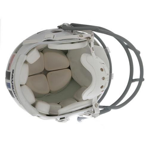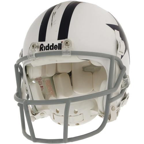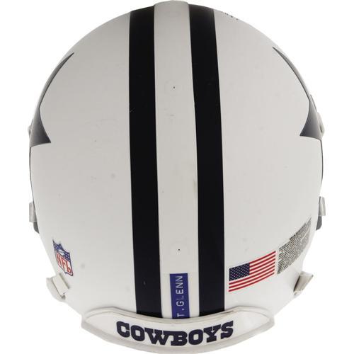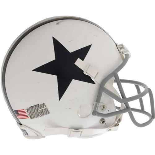 <B>2006 Terry Glenn Game Worn Throwback Helmet.</B></I> Classic white helmet with blue stars and center striping shows some rough and tumble wear from a Christmas day meeting with the Eagles. Interior "VSR-4" padding likewise shows sweaty wear, and number "57" markered over each ear hole suggests previous usage by another player, not uncommon for alternate uniform pieces such as this. Original chinstrap is present. Dymo tape "T. Glenn" applied to rear center stripe above custom "Cowboys" bumper. Decals of the NFL logo, the American flag, and warning label are affixed in their proper positions. A fine keepsake from another 1,000+ yard season for this veteran receiver out of Ohio State.<BR><BR><b>Shipping:</b> Clothing, Costumes & Jerseys (<a target="_blank" href="http://www.heritageauctions.com/common/shipping.php">view shipping information</a>)