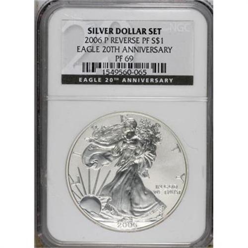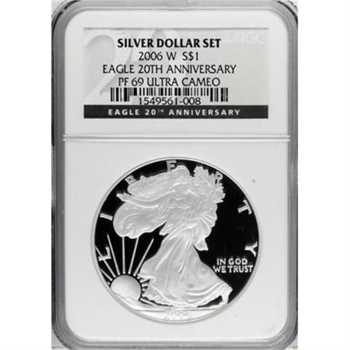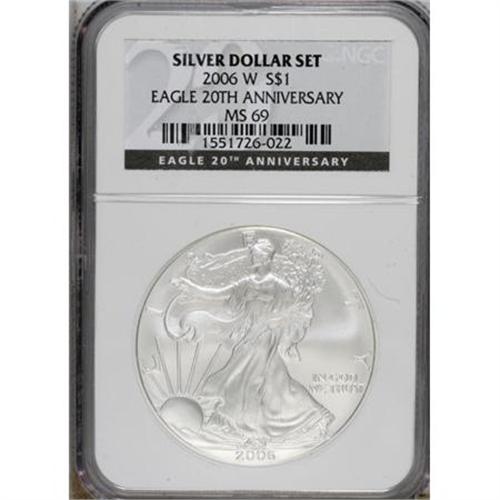 <B>2006 Three Coin NGC Certified Silver Dollar, Eagle 20th Anniversary Set. Included are: 2006-W MS69; 2006-P Reverse Proof, PR69;</B></I> and a <B>2006-W PR69 Ultra Cameo.</B></I><BR><BR><b>Shipping:</b> Coins & Currency (<a target="_blank" href="http://www.heritageauctions.com/common/shipping.php">view shipping information</a>)