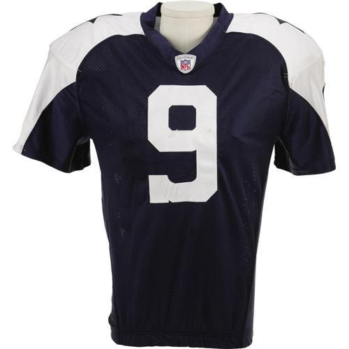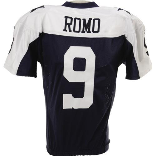 <B>2006 Tony Romo Game Worn Throwback Uniform.</B></I> Five touchdown passes in the November 23rd meeting with the Tampa Bay Buccaneers further convinced Cowboys fans that Romo was the right man for the quarterback position. This is the uniform he wore that day (and again in a loss to the Eagles on Christmas day), exhibiting appropriate QB wear with a few turf stains and helmet marks suffered when the pocket broke down. Number "9" is sewn in tackle twill to chest, back and shoulders of jersey, and sleeves are the loose quarterback style. "Romo" sewn across rear nameplate. The "05-50" label inside collar notes that this jersey was held over for use the year after production. Custom elasticized waist. Pants feature "Reebok" labeling with "34" and "S.I." flap tags. Year "06" tag is sewn into waistband, which has markered number "9" to indicate Romo's ownership, as does the original belt, which has "06-34" strip tag. Don't let the last game of the 2006 season make you forget what a great success Romo was, and will continue to be. He's a star on the rise.<BR><BR><b>Shipping:</b> Clothing, Costumes & Jerseys (<a target="_blank" href="http://www.heritageauctions.com/common/shipping.php">view shipping information</a>)