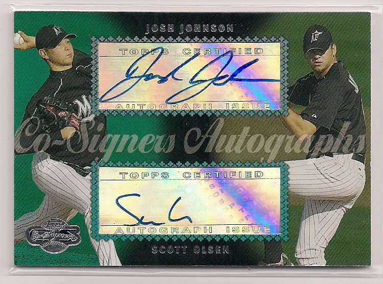 2006 Topps Co-Signers Josh Johnson/Scott Olsen Dual Autographed Card. This Insert is signed in Blue Sharpee by both players, and is Near Mint.