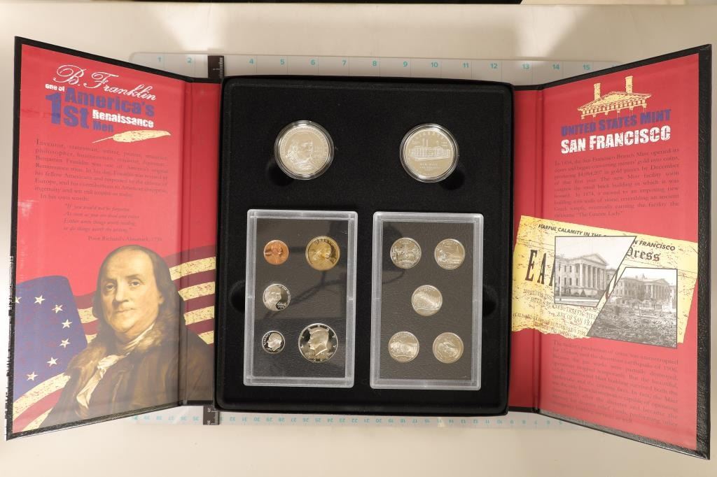 PACKAGING WITH CERTIFICATE. CONTAINS: BENJAMIN FRANKLIN AND OLD SAN FRANCISCO MINT SILVER DOLLARS, AND THE 2006 US MINT SET