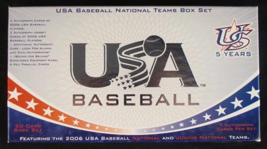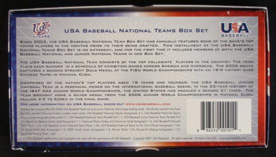 Since 2002, the USA Baseball National Team box set has annually featured some of the game's top young players in the months prior to being drafted. This installment of the USA Baseball National teams box set is no different, and for the first item it includes members of the both the USA Baseball National and Junior National teams in on box set.The USA Baseball National teams consists of players of the top collegiate players in the country. The teams plays each summer in a schedule of exhibition games across America and overseas. The 2006 squad captured a second straight gold medal at the FISU World Championships with an 18-9 victory over Chinese Taipei in Havana Cuba.Comprised of the nation's top players ages 18 years or younger, the USA Baseball Junior National Team is a perennial power on the international baseball scene. In the 22-year history of the IBAF AAA Junior World Championships, the United States has medaled a record 21 times. The team brought home a silver medal from the 2006 Junior World Championships in Havana Cuba, falling 4-3 to Korea in the final game.