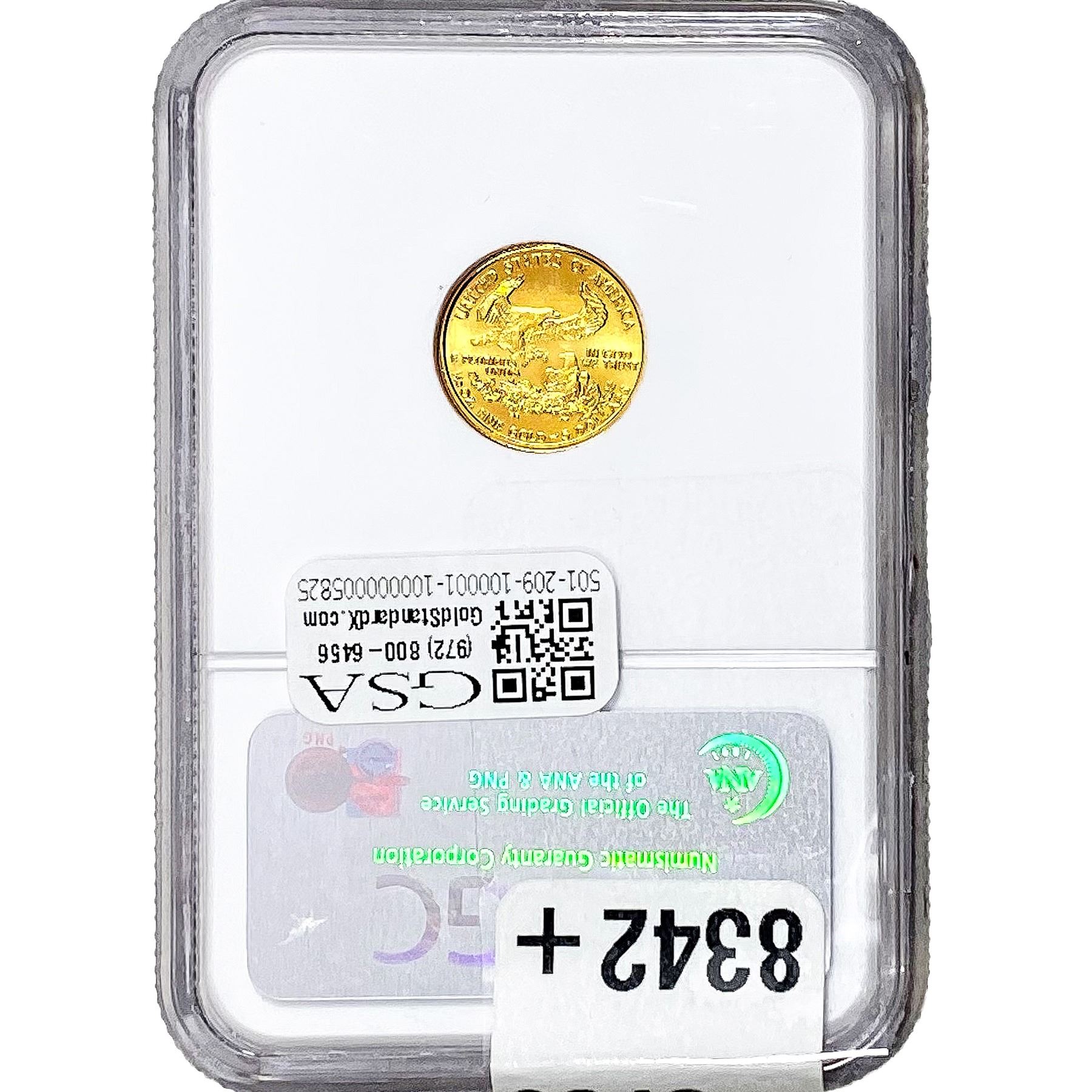 e. Coins sold referencing a third-party grading service are sold “AS IS” without any express or implied warranty, except for a guarantee by GSA that they are genuine. Removal or alteration of the holder, voids all of Bidder’s claims concerning that Product. Certain warranties may be available from the grading services and Bidders are referred to them for further details: Numismatic Guaranty Corporation (NGC), PO Box 4776, Sarasota, FL 34230, www.ngccoin.com/services/writtenguarantee.asp; Professional Coin Grading Services (PCGS), PO Box 9458, Newport Beach, CA 92658, www.pcgs.com/guarantee.html; ANACS, 6555 S. Kenton St., Ste. 303, Englewood, CO 80111; and Independent Coin Grading Co. (ICG), 7901 East Bellview, Ave., Suite 50, Englewood, CO 80111.