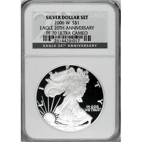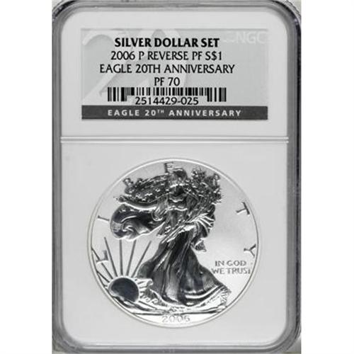 <B>2006 $1 20th Anniversary Silver Eagle set NGC. </B></I>The set includes a 2006-W MS69, 2006-P Reverse Proof PR70 and a 2006-W PR70 Deep Cameo.<BR><BR><b>Shipping:</b> Coins & Currency (<a target="_blank" href="http://www.heritageauctions.com/common/shipping.php">view shipping information</a>)