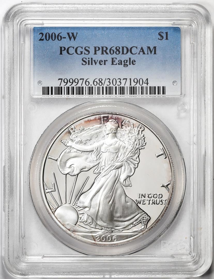 One 2006-W $1 Proof American Silver Eagle Coin PCGS PR68DCAM Toning. PCGS Graded.