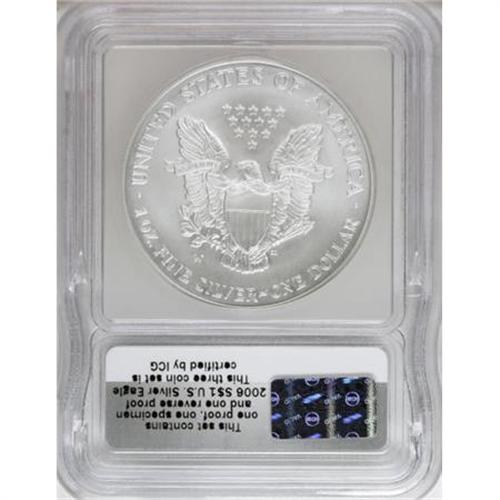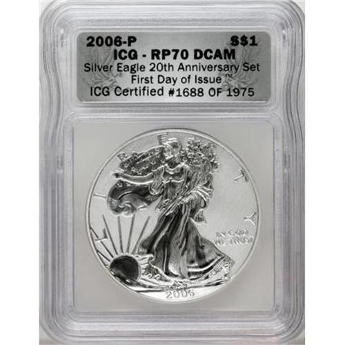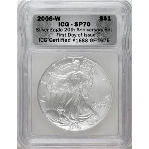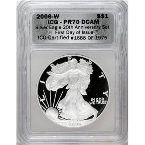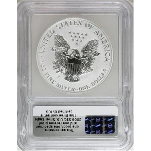 <B>2006-W $1 Silver Eagle 20th Anniversary ICG Proof Set</B></I>. The set includes the 2006-W SP70 ICG, 2006-P PR70 Deep Cameo ICG and a 2006-W PR70 Deep Cameo ICG. A wooden display box is included with this lot.<BR><BR><b>Shipping:</b> Coins & Currency (<a target="_blank" href="http://www.heritageauctions.com/common/shipping.php">view shipping information</a>)