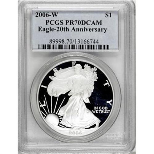 <B>2006-W $1 20th Anniversary Silver Eagle PR70 Deep Cameo PCGS.</B></I> PCGS Population (412/0). NGC Census: (0/0). (#799976)<BR><BR><b>Shipping:</b> Coins & Currency (<a target="_blank" href="http://www.heritageauctions.com/common/shipping.php">view shipping information</a>)