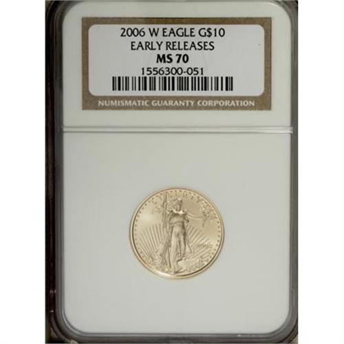 <B>2006-W $10 Quarter Ounce Gold Eagle MS70 NGC.</B></I> Early Releases. NGC Census: (0/0). PCGS Population (716/0). Numismedia Wsl. Price for NGC/PCGS coin in MS70: $500. (#79982)<BR><BR><b>Shipping:</b> Coins & Currency (<a target="_blank" href="http://www.heritageauctions.com/common/shipping.php">view shipping information</a>)