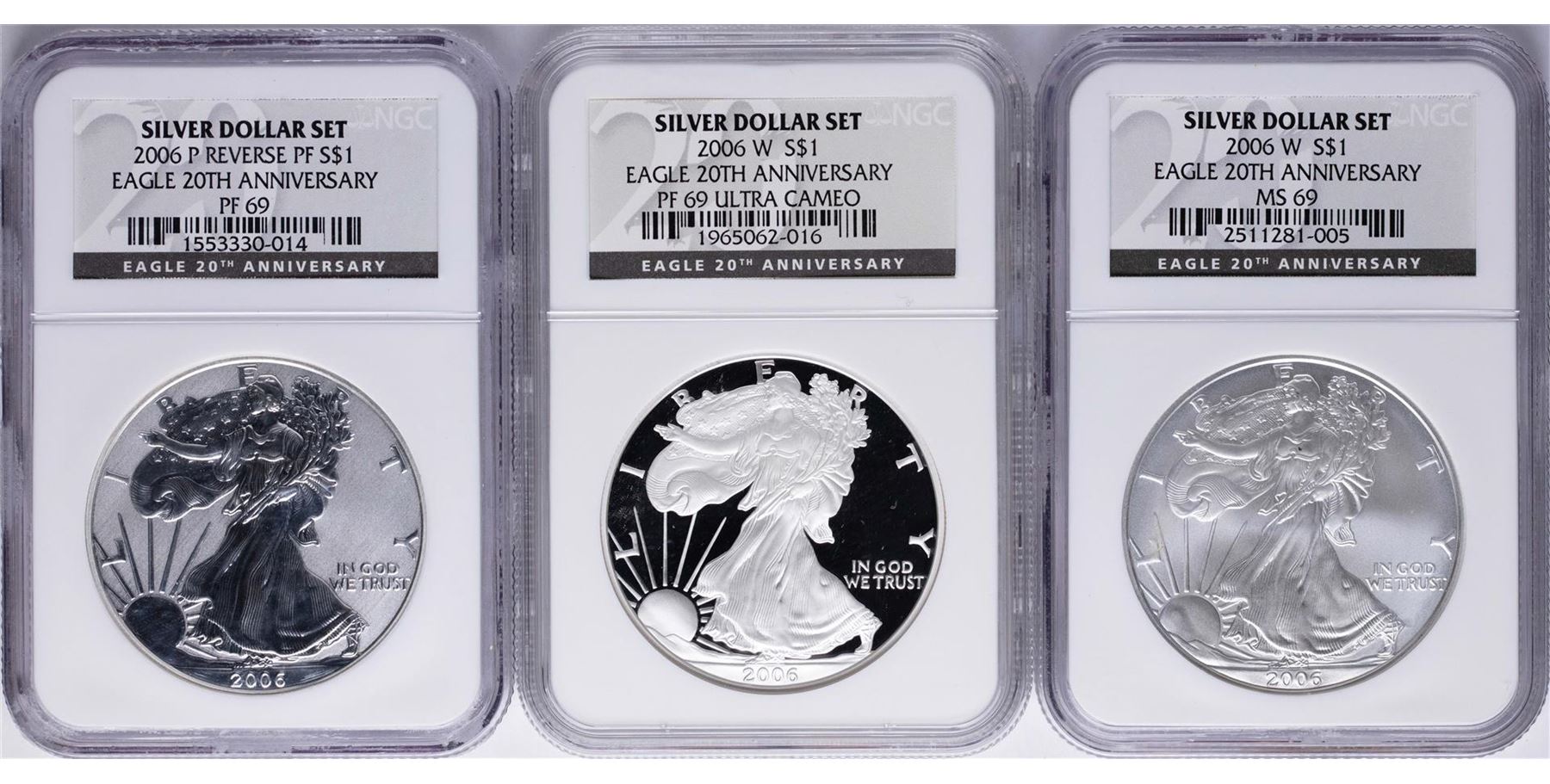 2006 W 20th Anniversary Silver American Eagle Dollar Set NGC MS69/PF69/PF69