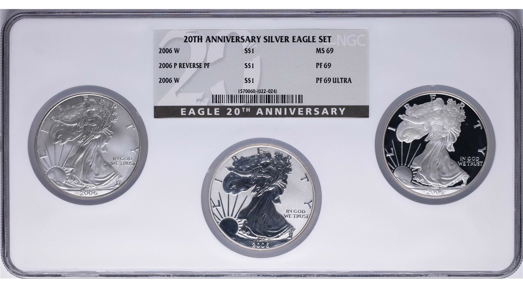 One 2006 W 20th Anniversary Silver American Eagle Dollar Set NGC MS69/PF69/PF69. NGC Certified.