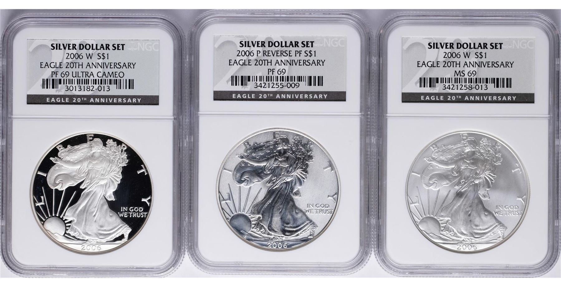 2006 W 20th Anniversary Silver American Eagle Dollar Set NGC MS69/PF69/PF69