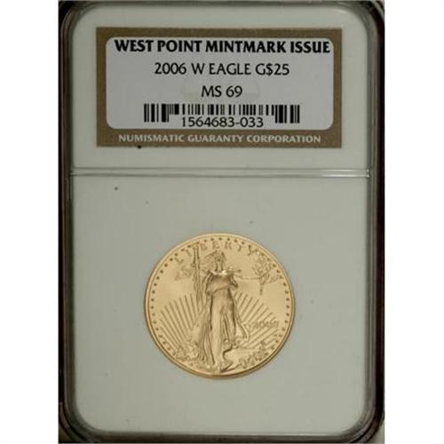 <B>2006-W $25 Half-Ounce Gold Eagle MS69 NGC.</B></I> West Point Mintmark Issue. NGC Census: (0/0). PCGS Population (3577/897). Numismedia Wsl. Price for NGC/PCGS coin in MS69: $585. (#79983)<BR><BR><b>Shipping:</b> Coins & Currency (<a target="_blank" href="http://www.heritageauctions.com/common/shipping.php">view shipping information</a>)