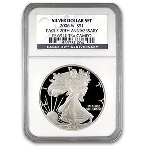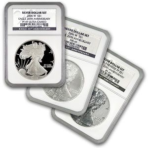 2006-W (3-Coin) Silver Eagle Set MS-69 & PF-69 UCAM NGC **|**|** Black label set! This special 20th Anniversary Silver American Eagle Set includes three Silver Eagle coins graded by PCGS. One Silver Eagle in the set is graded MS-69, while the other two (including the Reverse Proof) are graded PR-69. This set is even mo ; MSRP: $1600