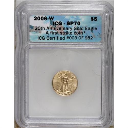 <B>2006-W $5 20th Anniversary Gold Eagle Tenth-Ounce SP70 ICG.</B></I> A First Strike Coin. NGC Census: (0/0). PCGS Population (746/0). (#79980)<BR><BR><b>Shipping:</b> Coins & Currency (<a target="_blank" href="http://www.heritageauctions.com/common/shipping.php">view shipping information</a>)