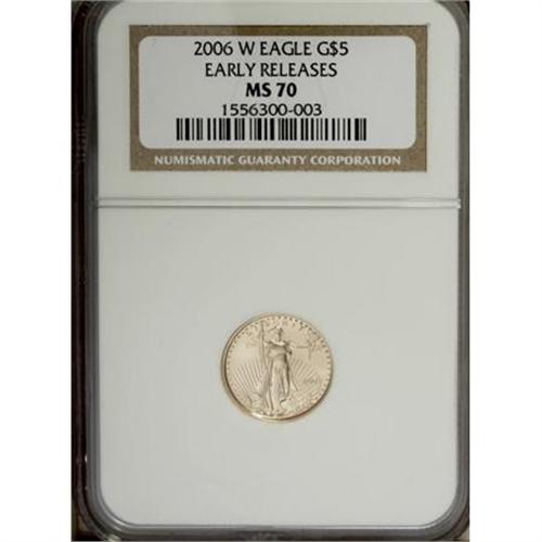 <B>2006-W $5 Tenth-Ounce MS70 NGC.</B></I> Early Releases. NGC Census: (0/0). PCGS Population (1027/0). Numismedia Wsl. Price for NGC/PCGS coin in MS70: $215. (#79980)<BR><BR><b>Shipping:</b> Coins & Currency (<a target="_blank" href="http://www.heritageauctions.com/common/shipping.php">view shipping information</a>)