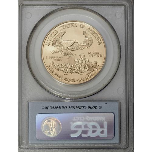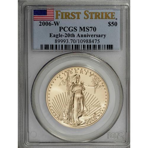 <B>2006-W $50 One-Ounce Gold 20th Ann. MS70 PCGS.</B></I> Designated a First Strike by PCGS. The shining surfaces have slight reflectivity on this exactingly struck and thoroughly perfect piece. The honey-gold fields fade to straw-gold at the rims.<BR><BR><b>Shipping:</b> Coins & Currency (<a target="_blank" href="http://www.heritageauctions.com/common/shipping.php">view shipping information</a>)