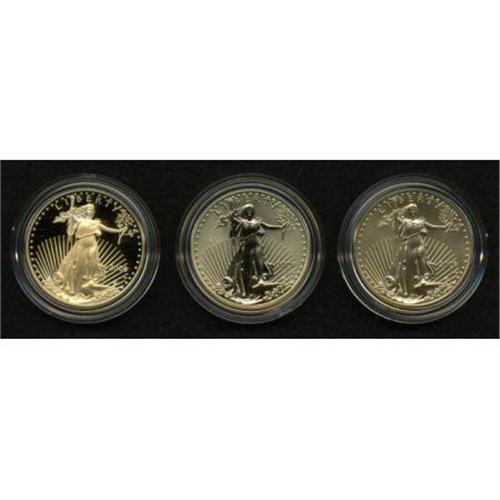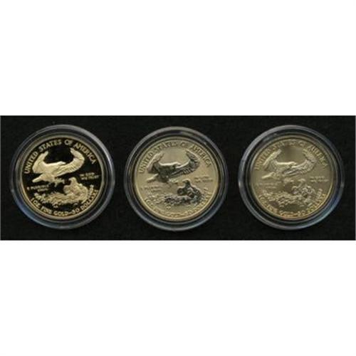 <B>2006-W 20th Anniversary American Eagle Gold Set.</B></I> This scarce three-piece set of one-ounce gold eagles contains a reverse proof, a regular proof, and an Uncirculated finish example. All three coins appear immaculate, and are housed in the gold box and black case of mint issue. The certificate of authenticity is included.<BR><BR><b>Shipping:</b> Coins & Currency (<a target="_blank" href="http://www.heritageauctions.com/common/shipping.php">view shipping information</a>)