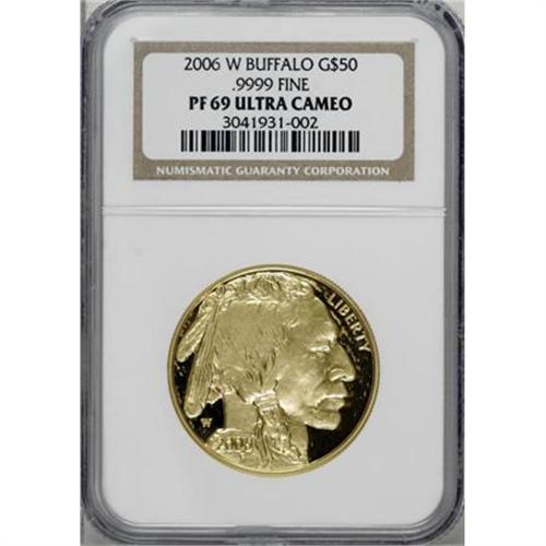 <B>2006-W $50 One-Ounce Gold Buffalo PR69 Deep Cameo NGC.</B></I> NGC Census: (10650/11248). PCGS Population (5578/1555). Numismedia Wsl. Price for NGC/PCGS coin in PR69: $900. (#9990)<BR><BR><b>Shipping:</b> Coins & Currency (<a target="_blank" href="http://www.heritageauctions.com/common/shipping.php">view shipping information</a>)