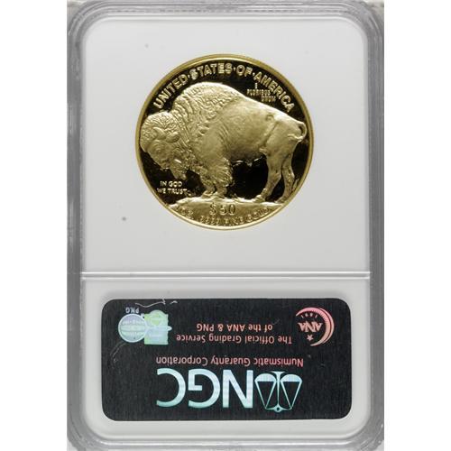<B>2006-W $50 Buffalo PR70 Deep Cameo NGC.</B></I> Fully struck and pristine, with awesome deep cameo contrast on both sides. The Buffalo nickel design is reproduced exactly, even down the typical orange-peel texture in the fields seen on the initial 1913 issue. This bullion gold piece represents the first issue of official American coinage struck in 24 karat (.999% pure) gold.<BR><BR><b>Shipping:</b> Coins & Currency (<a target="_blank" href="http://www.heritageauctions.com/common/shipping.php">view shipping information</a>)