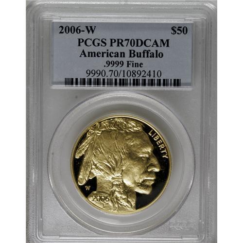 <B>2006-W $50 One-Ounce Gold Buffalo PR70 Deep Cameo PCGS.</B></I> With broad areas of deep frost and contrasting zones of textured brilliance, this modern proof has eye appeal aplenty. One ounce of pure golden perfection.<BR><BR><b>Shipping:</b> Coins & Currency (<a target="_blank" href="http://www.heritageauctions.com/common/shipping.php">view shipping information</a>)