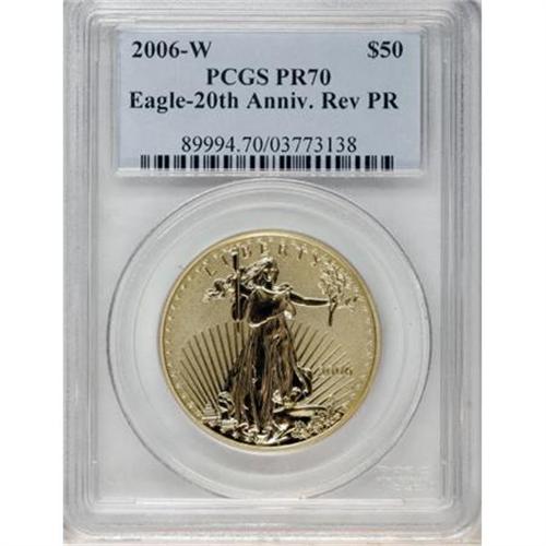 <B>2006-W $50 One-Ounce Gold Eagle Reverse Proof PR70 PCGS.</B></I> An immaculate representative of this visually distinctive issue, one that offers undeniable contrast between the frosted devices and the impeccable polish of the decisively struck devices. An impressive and desirable piece for the moderns enthusiast.<BR><BR><b>Shipping:</b> Coins & Currency (<a target="_blank" href="http://www.heritageauctions.com/common/shipping.php">view shipping information</a>)