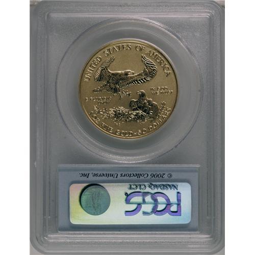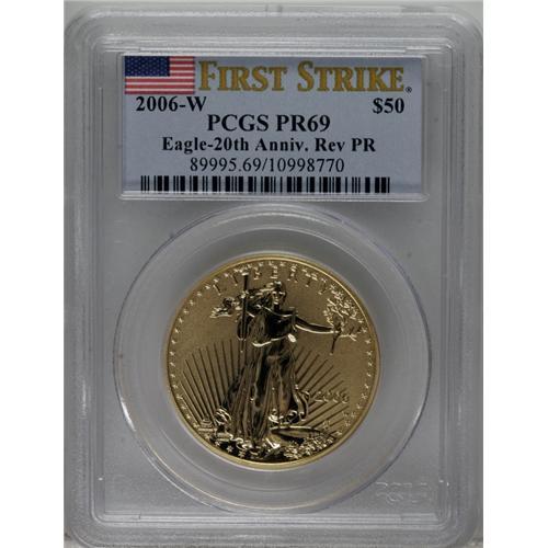 <B>2006-W $50 One-Ounce Gold Reverse Proof PR69 PCGS.</B></I> Flashy devices and fine-grain fields are the hallmarks of this 20th Anniversary proof variety. An immaculate and penetratingly struck specimen, worthy of the finest modern bullion collection.<BR><BR><b>Shipping:</b> Coins & Currency (<a target="_blank" href="http://www.heritageauctions.com/common/shipping.php">view shipping information</a>)