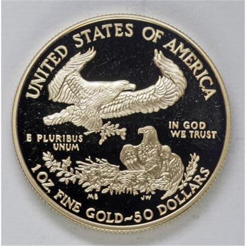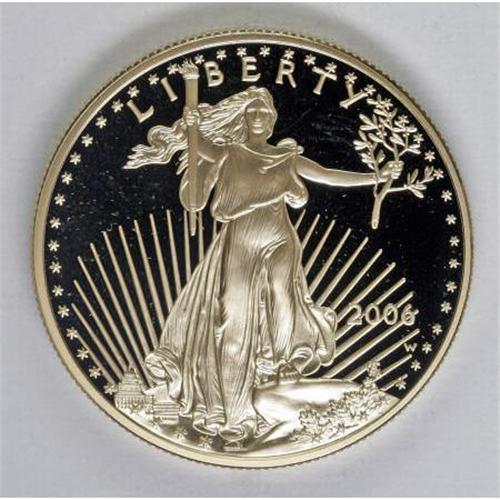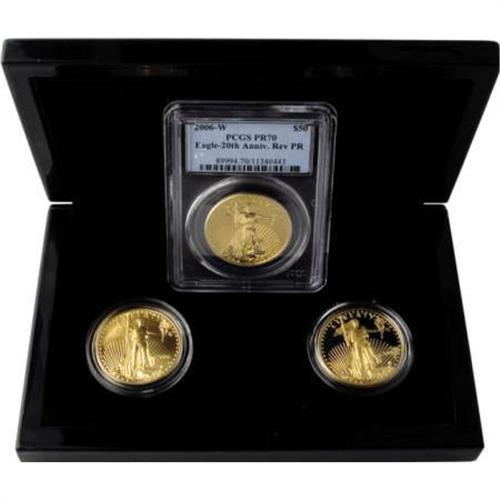 <B>2006-W $50 Reverse Proof PR70 PCGS.</B></I> The shining, deep black-gold devices project from the satiny fields of this technically perfect exemplar. Part of the three piece 20th Anniversary set, which contains a <B>2006-W One Ounce Gold American Eagle</B></I> and a <B>2006-W One Ounce Proof Gold American Eagle</B></I>, each of which is also included in this lot, along with the original Mint packaging.<BR><BR><b>Shipping:</b> Coins & Currency (<a target="_blank" href="http://www.heritageauctions.com/common/shipping.php">view shipping information</a>)